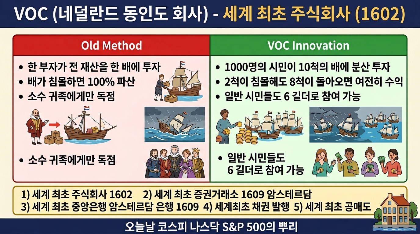 VOC가 주식을 발행한 이유는 단 하나, 위험을 나누기 위해서였습니다. 우리가 공부한 **ETF 입문 - 과일 바구니 전략**에서 "사과 한 알보다 과일 바구니"를 강조한 것이 바로 이 VOC의 정신입니다.