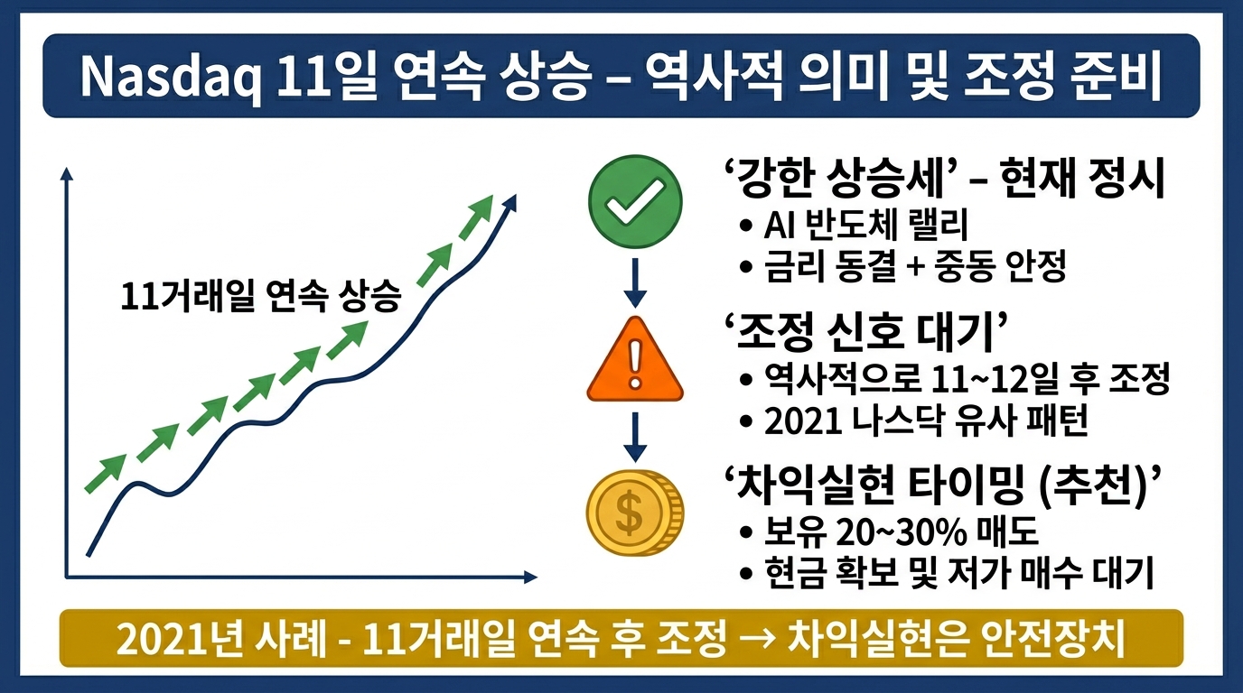 나스닥 11거래일 연속 상승은 **"매우 강한 상승"이자 동시에 “조정 가능성이 높은 구간”**입니다. 이런 상황에서는 "무한 상승"을 믿기보다 "수익 확보"를 우선하세요.