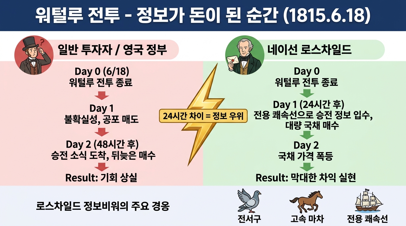 하루 뒤, 영국 정부의 공식 승전보가 런던에 울려 퍼지자 국채 가격은 천정부지로 치솟았습니다. 이 단 하루의 **‘정보 비대칭’**이 로스차일드를 유럽 최고의 금융 제국으로 만들었습니다.